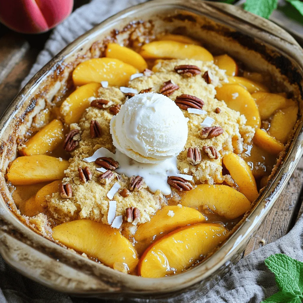 ![- 4 cups fresh peaches, peeled and sliced - 1 cup granulated sugar - 1 teaspoon ground cinnamon - 1 box (15.25 oz) yellow cake mix - 1 cup unsalted butter, melted - 1 cup chopped pecans (or walnuts) - 1 cup unsweetened coconut flakes (optional) - Vanilla ice cream for serving (optional) This Peach Cobbler Dump Cake is simple because it uses fresh peaches. You can peel and slice them easily. The sweetness comes from the granulated sugar. This adds a nice touch to the dessert. Ground cinnamon adds warmth and flavor. You will also need a box of yellow cake mix. This is the magic that makes it a dump cake. Simply pour this over the peach mixture later. Melted butter gives a rich flavor and helps the cake mix brown nicely. Adding nuts, like pecans or walnuts, gives a nice crunch. Coconut flakes are optional but they add a fun twist. Serve it warm with vanilla ice cream for a creamy contrast. You can find the complete instructions in the Full Recipe. Enjoy making this tasty dish! - Preheat the oven to 350°F (175°C). - Combine 4 cups of sliced peaches, 1 cup of sugar, and 1 teaspoon of cinnamon in a bowl. Mix well until the peaches are coated. - Pour the peach mixture into a greased 9x13 inch baking dish. Spread it evenly across the bottom. - Next, sprinkle 1 box of dry yellow cake mix over the peaches. Make sure it covers them fully. - Drizzle 1 cup of melted butter over the cake mix. Try to cover as much of the mix as you can. - Add 1 cup of chopped pecans and 1 cup of coconut flakes (if you like) on top. Press them gently into the mixture. - Bake in the preheated oven for 40-45 minutes. Look for a golden brown top and bubbly edges. - After baking, let it cool for about 10 minutes before serving. This helps the flavors settle. For a special touch, serve warm with a scoop of vanilla ice cream. Enjoy every bite of this Peach Cobbler Dump Cake! For the complete details, check out the Full Recipe. Choosing the right peaches is key. I recommend using fresh, ripe peaches. They should smell sweet and feel firm yet slightly soft. If fresh peaches are not available, canned peaches work too. Just make sure to drain them well. Even coverage of the cake mix and butter ensures a great texture. After pouring the dry cake mix over the peaches, drizzle the melted butter evenly. This helps create a crispy top. You want each bite to have that perfect crunch. One common mistake is overmixing the peach mixture. Just toss the peaches gently with sugar and cinnamon. If you mix too hard, the peaches can break apart. You want chunks of peach in your dump cake. Another mistake is not allowing enough cooling time before serving. Let the cake cool for about ten minutes. This helps the layers set and makes serving easier. You want the slices to hold together nicely. {{image_2}} You can easily swap peaches for other fruits in this recipe. Apples and cherries work great. For apples, use tart ones like Granny Smith. Cherries add a nice sweetness and color. Just make sure to slice or pit them as needed. Mixing fruits can create fun flavor blends. Try combinations like peaches and blueberries for a twist! You have many choices for toppings. If you want crunch, use walnuts or almonds instead of pecans. Feel free to leave out coconut flakes if you prefer. Adding spices can bring new life to your cobbler. Nutmeg and allspice make it warm and cozy. Just sprinkle a bit on top of the cake mix, and enjoy the new flavor! If you need gluten-free options, use a gluten-free cake mix. Many brands offer good choices. For a vegan version, swap butter for coconut oil or vegan butter. Check the cake mix to ensure it is dairy-free. These changes let everyone enjoy this tasty treat without worry. You can still have a delicious dessert that fits your needs! For the complete recipe, check out the Full Recipe. To store leftovers of your peach cobbler dump cake, cover it tightly with plastic wrap. You can also use aluminum foil. Place it in the fridge. This keeps it fresh for a few days. Avoid leaving it uncovered, as it may dry out. If you want to freeze your dump cake, let it cool completely first. Cut it into portions for easy serving later. Wrap each piece in plastic wrap. Then, place them in a freezer bag. Squeeze out as much air as possible. When you're ready to enjoy it, thaw in the fridge overnight. Reheat in the oven at 350°F (175°C) for about 15-20 minutes. In the fridge, your dump cake stays good for about 3-4 days. If you freeze it, it can last for up to 3 months. After that, the flavor and texture may change. For the best taste, try to eat it sooner. If you want the full recipe, check out the [Full Recipe]. The main difference lies in the texture and how you prepare them. A dump cake is simpler. You layer the ingredients in a dish without much mixing. You pour the fruit, sprinkle cake mix, and drizzle butter. The cake mix creates a crispy topping while the fruit stays moist. In a traditional peach cobbler, you often make a batter. You mix flour, sugar, and milk, then pour it over the fruit. As it bakes, the batter forms a softer crust. So, dump cake is quicker and has a crunchier top, while cobbler is softer and more cake-like. Yes, you can prepare this dump cake ahead. To do this, follow the steps up to layering the ingredients. Cover the dish and store it in the fridge for up to a day. When you are ready to bake, take it out and let it rest for 30 minutes. Preheat your oven and bake as directed. This will ensure your dump cake is fresh and warm. If you have leftovers, you can reheat them in the oven or microwave. Just add a scoop of ice cream on top for extra yum! Look for a few signs to tell if your dump cake is ready. First, check the color. The top should be golden brown and look crispy. You will also see bubbles around the edges of the dish. This means the fruit is hot and juicy. If you gently press the top, it should feel firm but not hard. If it looks good and feels right, it's time to take it out. Let it cool for about