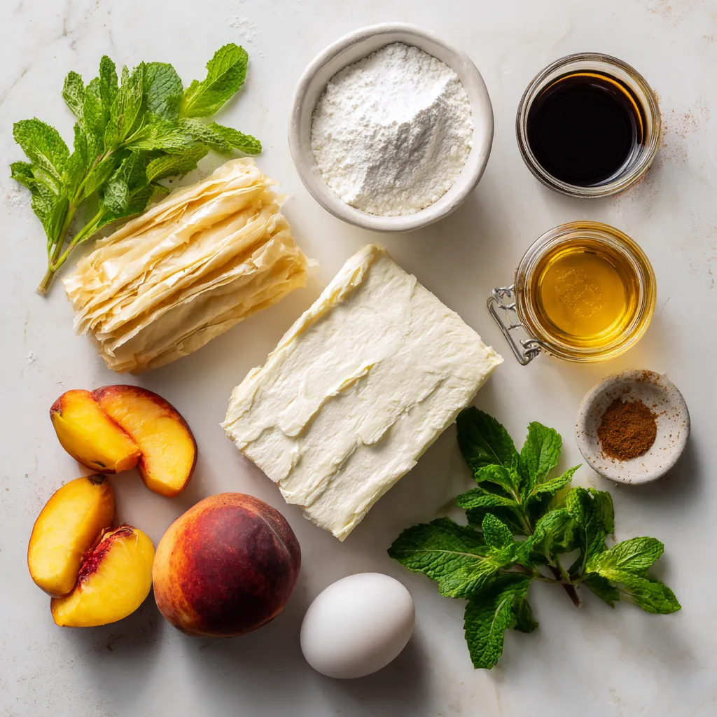 To make peach cream cheese tarts, gather these ingredients. First, get a package of store-bought puff pastry. It saves time and works great. You need eight ounces of softened cream cheese. This cheese makes the tarts creamy and rich.