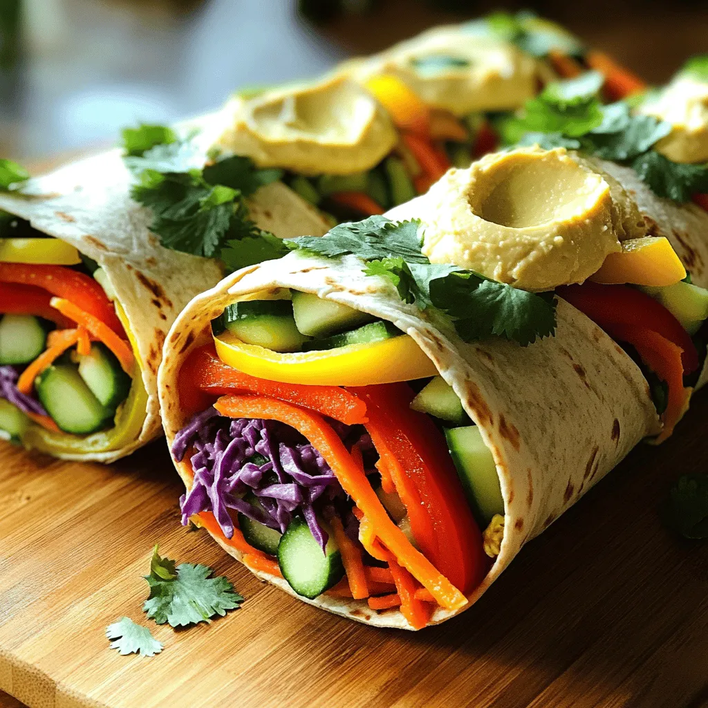 ![- 4 large whole wheat tortillas - 1 cup red bell pepper, thinly sliced - 1 cup yellow bell pepper, thinly sliced - 1 cup cucumber, julienned - 1 cup carrot, grated - 1 cup purple cabbage, shredded - 1 avocado, sliced - 1 cup hummus (any flavor) - 1 tablespoon lemon juice - Salt and pepper to taste - Fresh cilantro or parsley, for garnish Each ingredient in these wraps serves a purpose. Whole wheat tortillas provide fiber and energy. Red and yellow bell peppers add vitamin C, which helps boost your immune system. Cucumbers add hydration. Carrots bring in beta-carotene for your eyes. Purple cabbage is rich in antioxidants. Avocado contributes healthy fats for heart health, while hummus adds protein and flavor. Lemon juice helps improve digestion and keeps the avocado fresh. Finally, herbs like cilantro or parsley can add even more nutrients. I prefer using fresh veggies for the best taste and crunch. Fresh ingredients also have more nutrients. However, frozen veggies can be a great option when fresh ones aren't available. Just make sure to thaw and drain them well. This will help keep your wraps from getting soggy. You can also use frozen hummus if you are in a pinch. Just let it thaw before spreading it on the tortilla. First, we need to prepare the veggies. Slice the red and yellow bell peppers into thin strips. Next, julienne the cucumber into long, thin pieces. Grate the carrot using a box grater. Finally, shred the purple cabbage. This colorful mix will make your wraps pop! Now, let’s layer our veggies. Start with a large whole wheat tortilla on a flat surface. Spread a thick layer of hummus across the tortilla. Leave about an inch from the edges. Next, lay the red bell pepper strips first. Follow with the yellow bell pepper, cucumber, grated carrot, and shredded cabbage. Place the avocado slices on top. This rainbow pattern looks great and tastes amazing! Wrapping your veggie creation is simple. Begin at the edge closest to you. Fold it over the filling and press down gently. Roll it away from you, tucking in the sides as you go. This keeps everything secure inside. Once wrapped, use a sharp knife to cut it in half. Repeat this for the other tortillas. Enjoy your Rainbow Veggie Wraps fresh or store them for later! For the full recipe, check [Full Recipe]. To keep your veggies fresh, store them in a cool, dry place. Wrap cut veggies in a damp paper towel. This helps them stay crisp. Use airtight containers for sliced veggies. You can also add a little lemon juice to prevent browning. Keeping them separate until you are ready to use them helps too. Hummus adds creaminess to rainbow veggie wraps. For a twist, try roasted red pepper hummus. It pairs well with sweet bell peppers. You can also use garlic hummus for a zing. If you like spice, go for spicy hummus. Each flavor can change the wrap's taste, making it fun to explore. You can easily change these wraps to fit your diet. If you want a low-carb option, use large lettuce leaves instead of tortillas. For a protein boost, add grilled chicken, tofu, or beans. If you are vegan, stick with plant-based proteins. Discuss your preferences to make the wraps your own. For the full recipe, follow the steps outlined above for a delightful meal that fits your needs! {{image_2}} You can swap tortillas for lettuce or rice paper. Lettuce wraps give a crisp bite. Use large leaves like romaine or butter lettuce. They are low in carbs and add a fresh taste. Rice paper adds a fun twist. Just soak it in warm water until soft. Then, wrap your veggies inside. Both options are light and tasty. Adding protein makes your wrap more filling. Grilled chicken is a great choice. It adds flavor and keeps it hearty. You can also use tofu for a plant-based option. Just press it to remove excess water, then grill or sauté. Beans are another easy option. Black beans or chickpeas boost fiber and protein. Mix them in with your veggies for a satisfying meal. Using seasonal veggies can enhance your wrap. In spring, try adding radishes or snap peas for crunch. Summer brings zucchini or cherry tomatoes for sweetness. In fall, roasted sweet potatoes or butternut squash offer warmth. Winter veggies like kale or Brussels sprouts can add depth. Choose what's fresh for the best flavor. Each season brings new colors and tastes to your wraps. For the full recipe, check out the original instructions and ingredient list. To store leftover wraps, wrap them tightly in plastic wrap. You can also use aluminum foil. Place them in an airtight container. This keeps them fresh and prevents drying out. If you have cut wraps, store each half in separate containers. When prepping these wraps, make all the veggies ahead. Keep them in separate containers. This way, you can mix and match your wraps each day. You can also prepare the hummus in bulk. Use different flavors to change it up. Making wraps this way saves time and keeps things fun. Fresh veggies last about 3 to 5 days in the fridge. Make sure they are dry before storing. Hummus can last about a week in the fridge. If you buy store-bought, check the label for dates. Whole wheat tortillas stay fresh for about 2 weeks if sealed well. Always check for any signs of spoilage before using. The best way to prevent avocado from browning is to use lemon juice. The acid in lemon juice slows down the oxidation process. I mix the sliced avocado with a tablespoon of lemon juice. This keeps it fresh and bright. Add a pinch of salt and pepper for taste. Always cut the avocado right before you use it for the best results. Yes, you can use many different sauces instead of hummus. Try using tzatziki, guacamole, or a yogurt-based sauce. Each sauce adds a unique flavor to the wraps. You can even use a spicy sauce if you want a kick. Just make sure the sauce spreads easily on the tortilla. To make these wraps spicier, you can add spicy sauces. Hot sauce or sriracha works great. You can also add sliced jalapeños for a fresh kick. Another option is to mix 