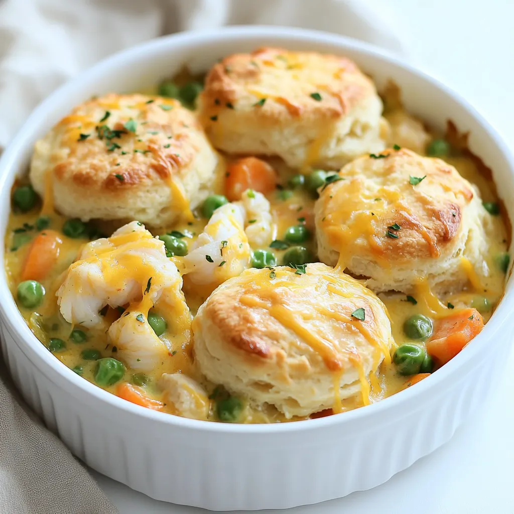 This dish brings comfort to your kitchen. You can easily find these ingredients at your local store. The chicken and lobster give it a rich flavor. The mix of peas and carrots adds color and nutrition. The biscuits on top create a fluffy layer that is hard to resist.