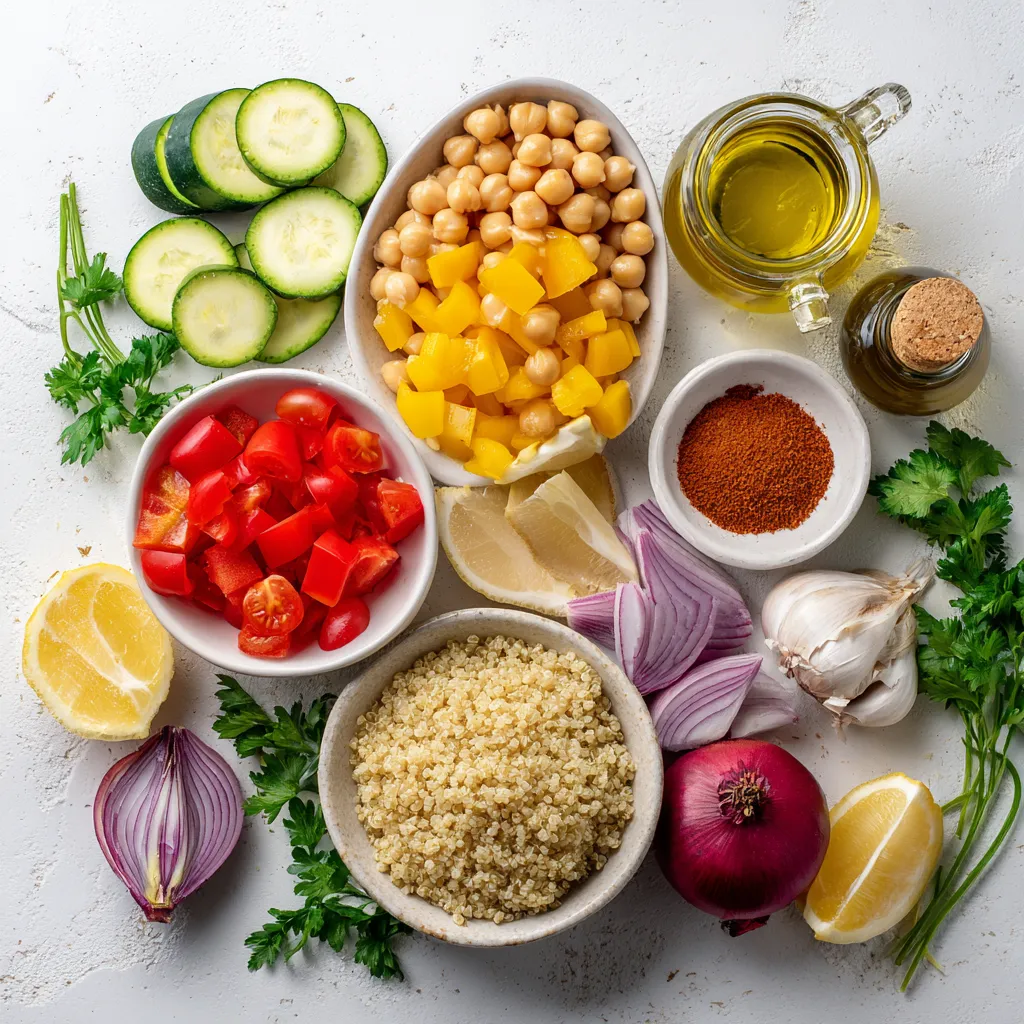 - In a large mixing bowl, combine the chickpeas, diced bell peppers, chopped zucchini, halved cherry tomatoes, and red onion.
