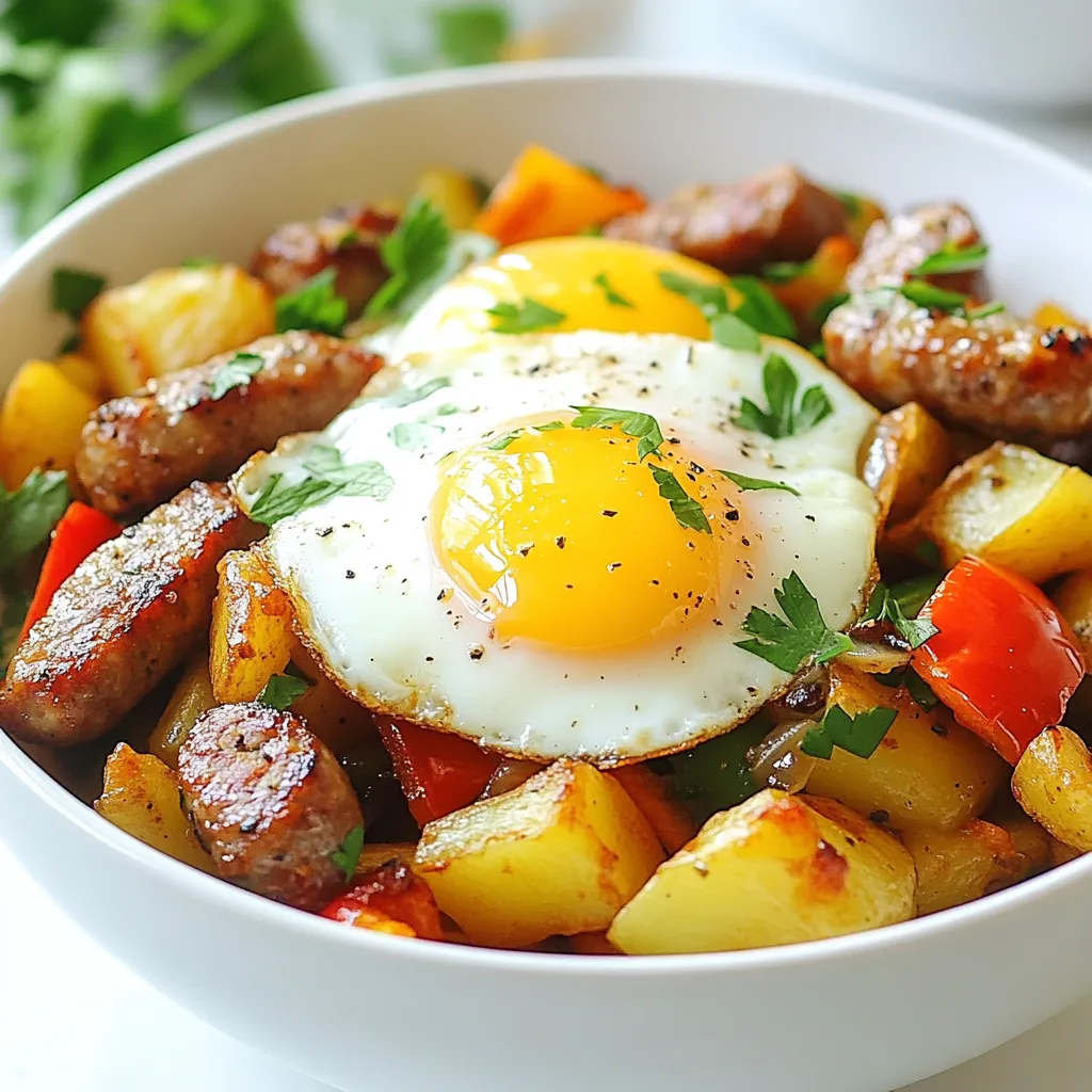 6. Assemble the Bowls: Grab your bowls and layer in the sausage and potato mixture first. Then, top each bowl with a fried egg.