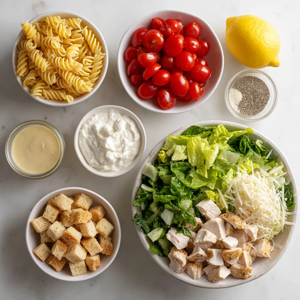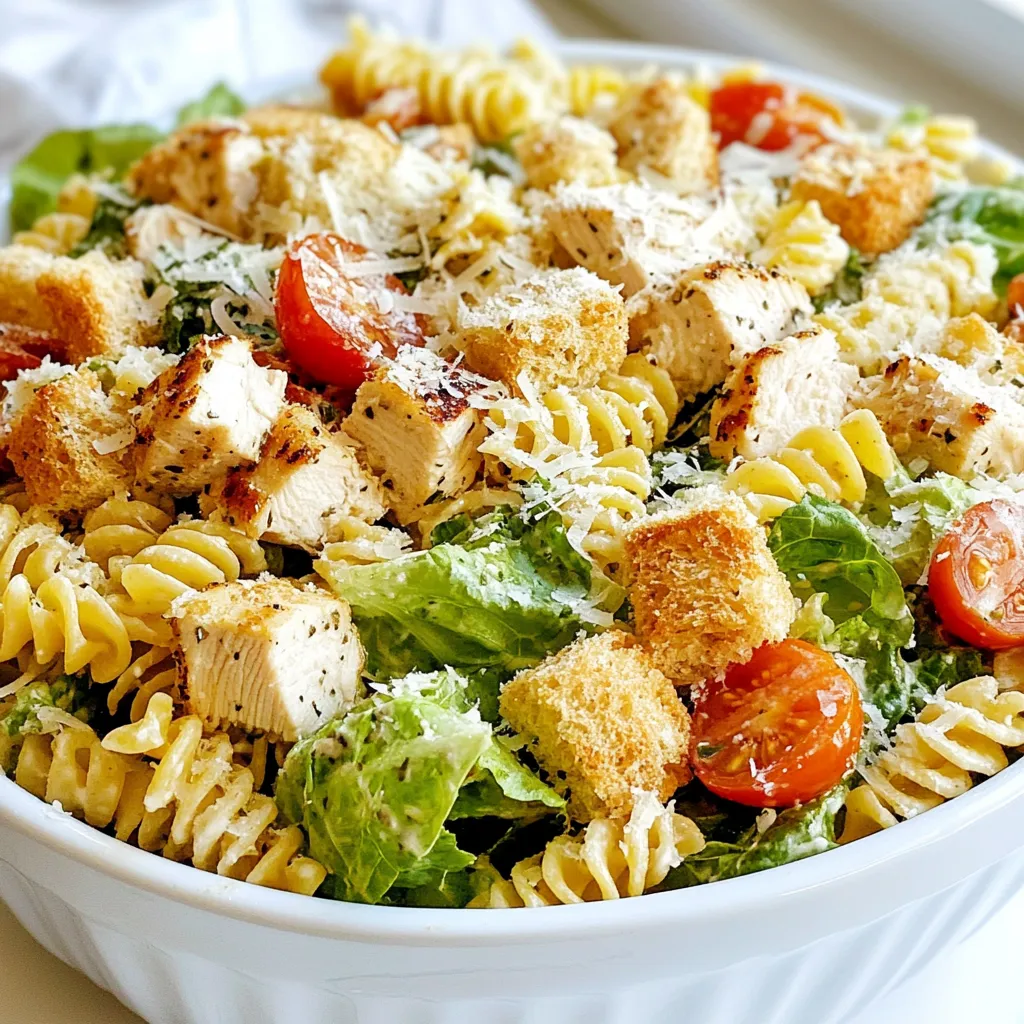 To make a tasty Chicken Caesar Pasta Salad, you need these key ingredients: