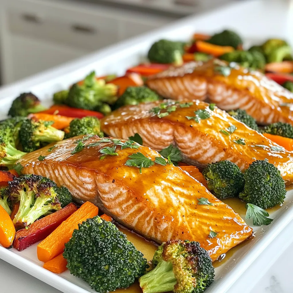 When serving, arrange the salmon and veggies on a large platter. The colors should pop! Drizzle any remaining glaze over the top. This adds shine and flavor. Sprinkle with fresh parsley for a bright touch. A beautiful presentation makes the meal feel special. Enjoy your dish with pride!
