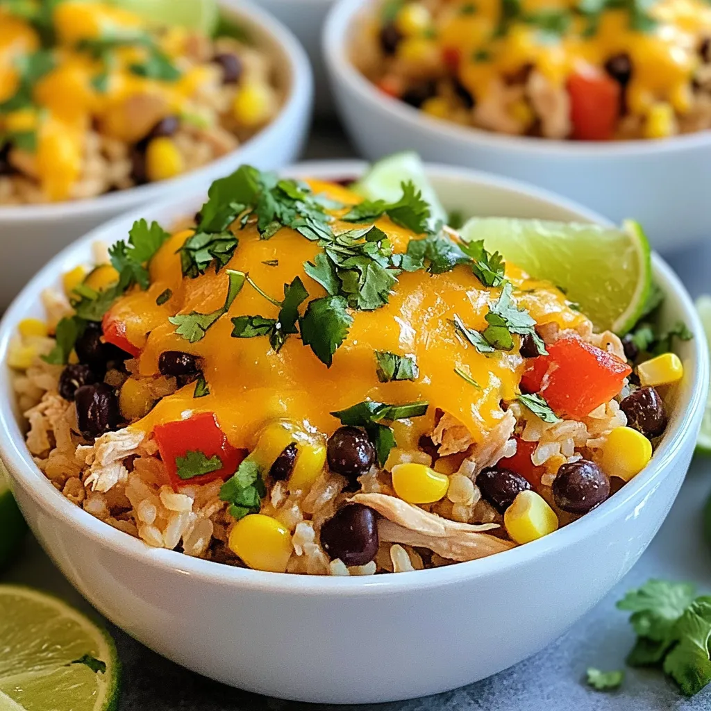 Garnishes bring your dish to life. The cheese melts over the hot chicken, adding creaminess. Cilantro adds freshness and color. A squeeze of lime brightens every bite, making each bowl pop with flavor.