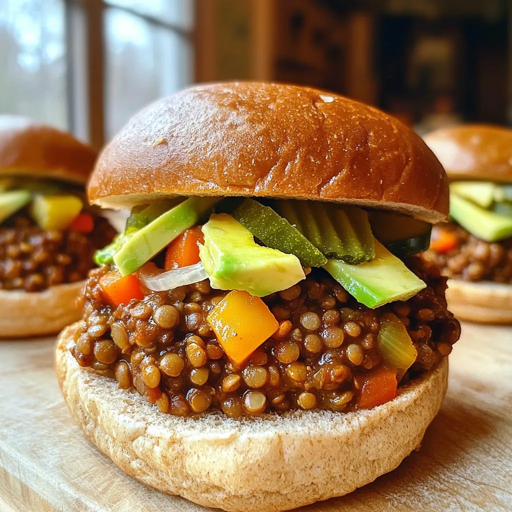 To serve, spoon the lentil mix onto whole wheat burger buns. You can add optional toppings like sliced pickles or creamy avocado. Coleslaw also makes a great topping. These add flavor and crunch. Enjoy your healthy and hearty meal!