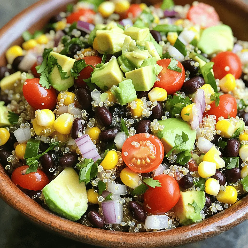 Gather these fresh ingredients before you start. Each adds a unique taste. Quinoa serves as the base. It’s nutty and full of protein. The vegetable broth gives it extra flavor. Black beans add fiber and texture. Cherry tomatoes bring sweetness and color. The red bell pepper adds crunch and a sweet taste. Corn gives a nice pop in every bite. Avocado makes the salad creamy and rich. Red onion adds a sharp bite. Fresh cilantro brings a bright note. Lime juice and olive oil create a zesty dressing. Cumin and chili powder add warmth and spice. Salt and pepper bring everything together. This mix makes a salad that’s fresh and exciting.