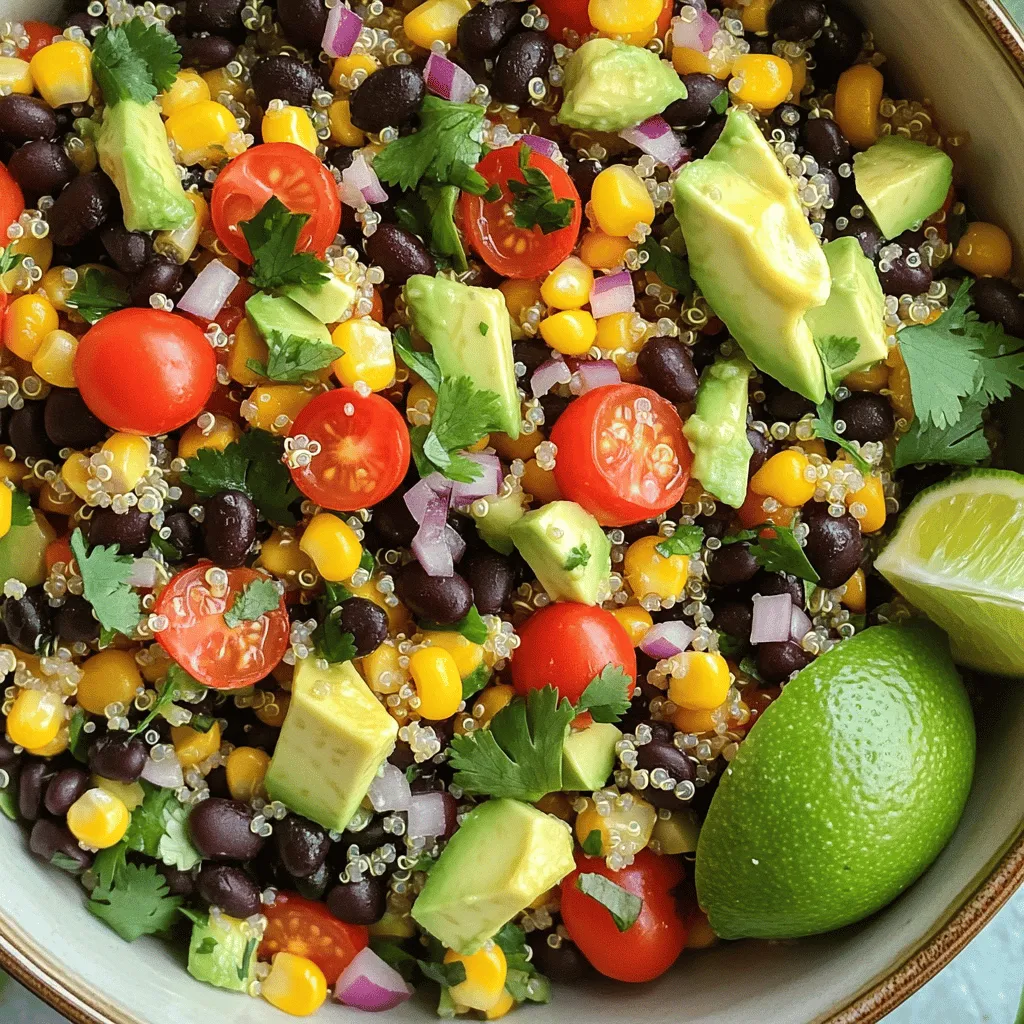 ![- 1 cup quinoa, rinsed - 2 cups vegetable broth or water - 1 can (15 oz) black beans, rinsed and drained - 1 cup corn kernels (fresh, frozen, or canned) - 1 red bell pepper, diced - 1 cup cherry tomatoes, halved - 1 avocado, diced - ¼ cup red onion, finely chopped - ½ cup fresh cilantro, chopped The main stars of this salad are the quinoa and black beans. Quinoa is a great grain. It is full of protein and fiber. Black beans add a creamy texture and taste. The corn gives a sweet crunch. Fresh veggies like tomatoes and peppers boost the flavor. I love adding avocado for its creaminess. Cilantro adds a fresh touch, making every bite pop. Each ingredient brings a unique taste and many nutrients. - Juice of 2 limes - 3 tablespoons olive oil - 1 teaspoon cumin - 1 teaspoon chili powder - Salt and pepper to taste The dressing is simple yet so tasty. Lime juice gives a zesty kick. Olive oil makes it smooth. Cumin and chili powder add warmth and depth. I adjust salt and pepper to balance the flavors. This dressing brings the whole salad together. It enhances each ingredient, making it shine. This salad is packed with nutrition. Each serving has about 250 calories. It is high in protein due to quinoa and beans. The fiber from all the veggies helps digestion. This salad is vegan and gluten-free, making it a great choice for many diets. You can feel good about enjoying this fresh dish! If you want to make it, check out the Full Recipe for details. Step 1: Combining quinoa with broth Start by rinsing 1 cup of quinoa under cold water. This step removes the bitter coating. In a medium pot, combine the rinsed quinoa with 2 cups of vegetable broth or water. This broth adds flavor. Step 2: Simmering and fluffing quinoa Bring the pot to a boil over medium-high heat. Once boiling, lower the heat. Cover the pot and let it simmer for 15 minutes. This allows the quinoa to absorb the liquid. After 15 minutes, take the pot off the heat. Let it sit for 5 more minutes. Finally, fluff the quinoa with a fork. Step 3: Chopping vegetables While the quinoa cooks, chop your veggies. Dice 1 red bell pepper and halve 1 cup of cherry tomatoes. Dice 1 avocado and finely chop ¼ cup of red onion. Rinse and drain 1 can of black beans, and prepare 1 cup of corn. Fresh, frozen, or canned corn works well. Step 4: Combining salad ingredients in a bowl In a large bowl, mix all these ingredients together. Add the black beans, corn, red pepper, cherry tomatoes, avocado, red onion, and ½ cup of chopped cilantro. This mix adds color and nutrition. Step 5: Whisking dressing ingredients In a small bowl, whisk together the juice of 2 limes, 3 tablespoons of olive oil, 1 teaspoon of cumin, and 1 teaspoon of chili powder. This dressing gives the salad its signature taste. Step 6: Adjusting seasoning After whisking, taste your dressing. Add salt and pepper as needed. Adjust the lime juice for extra zing if you like. Step 7: Adding quinoa and dressing to salad Once the quinoa is fluffy, add it to the large bowl with the salad ingredients. Pour the dressing over the top. Step 8: Tossing to combine Gently toss everything together until well mixed. You want the dressing to coat all the ingredients evenly. Enjoy your Southwest Quinoa Salad! For the full recipe, check out the details above. - Rinsing quinoa for better taste: Always rinse your quinoa before cooking. This step removes the saponins, which can taste bitter. Rinsing also makes the quinoa fluffier. Just place it in a fine-mesh strainer and rinse under cold water for a minute. - Timing for perfectly cooked quinoa: Cook quinoa on medium heat. When it boils, lower the heat and cover it. Let it simmer for about 15 minutes. After that, let it sit for 5 more minutes. Fluff it gently with a fork for the best texture. - Presentation tips for serving: Serve your salad in a large bowl to show off the colors. For individual servings, clear glass bowls work well. They highlight the beautiful layers of the salad. - Garnishing ideas for added flavor: Garnish with fresh cilantro and lime wedges. This adds a bright touch and enhances the flavor. You can also sprinkle some feta cheese for a creamy twist. - Adding spices or herbs to the dressing: Don’t hesitate to experiment! Add extra spices like smoked paprika or cayenne for a kick. Fresh herbs like parsley or dill can also brighten the dressing. - Customizing based on personal preferences: Make the salad your own! If you love heat, toss in some jalapeños. Prefer a sweeter taste? Add diced mango or pineapple for a tropical flair. For the full recipe, check out the [Full Recipe]. {{image_2}} You can easily switch up the beans in this salad. While black beans give great flavor, kidney beans work too. They add a nice color and a bit of sweetness. If you want to use different veggies, go for it! Try zucchini or bell peppers. You can also use frozen corn if fresh isn’t available. It’s all about what you like. Want a creamier dressing? Mix Greek yogurt with lime juice and spices. It adds richness and pairs well with the salad. If you’re short on time, grab a store-bought dressing. Look for one with bold flavors, like a spicy ranch or a cilantro lime option. This can save you time and still make your salad tasty. Seasonal produce can change your salad game. In summer, add fresh cucumber or radishes. In fall, roasted squash adds warmth. You can also swap out ingredients based on what you find at the market. This way, your salad stays fresh and exciting all year round. To keep your Southwest Quinoa Salad fresh, store it in an airtight container. Place it in the fridge right after serving. This will help maintain its bright flavors. The salad stays fresh for up to 3 days. However, the avocado may brown after a day. To prevent this, you can add lime juice to the avocado before storing. You might wonder, can you freeze quinoa salad? Yes, you can! Freezing is a great way to save extra portions. However, I recommend freezing only the quinoa and beans.