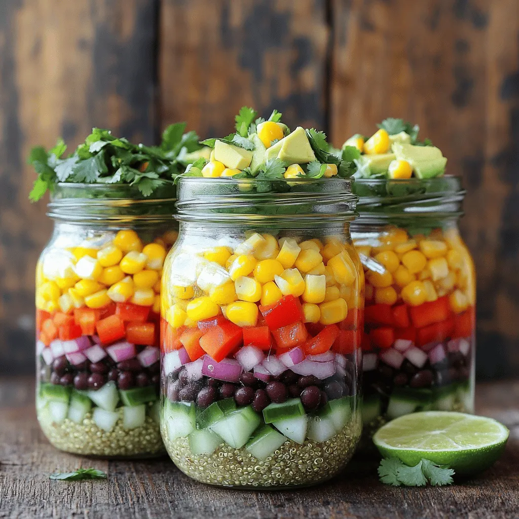 To make these jars, start by cooking the quinoa. Rinse 1 cup of quinoa. Combine it with 2 cups of vegetable broth in a pot. Bring it to a boil, then lower the heat. Cover and let it simmer for about 15 minutes. When done, fluff it with a fork and let it cool. Next, prepare the dressing. Whisk together lime juice, olive oil, cumin, chili powder, garlic powder, salt, and pepper in a bowl. Now, layer the ingredients in clean jars. Start with quinoa, then add black beans, corn, diced red bell pepper, red onion, and avocado. Drizzle some dressing on each layer. Finish with chopped cilantro and any leftover dressing. Seal the jars and refrigerate for at least 30 minutes. This lets the flavors mix well.