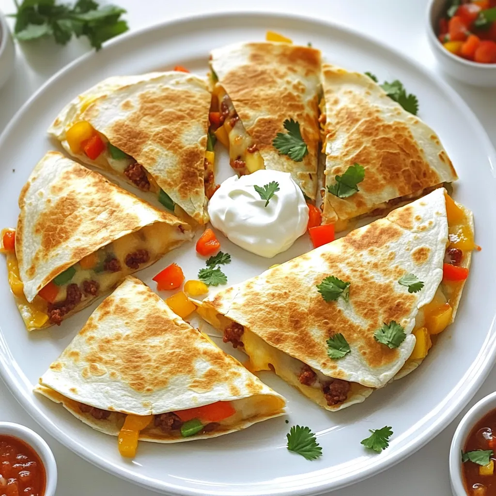 Make your quesadillas look great to serve. Slice them into wedges and arrange them on a big plate. Sprinkle fresh cilantro on top for color. Serve sour cream and salsa in small bowls beside the quesadillas. This makes it fun and inviting for everyone at the table. A beautiful plate makes the meal even better!