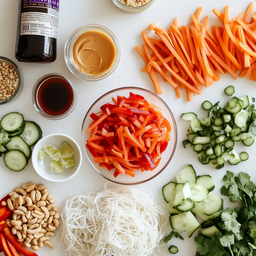Gathering the right ingredients is key to making this spicy peanut noodle salad. The main ingredients, like rice noodles and creamy peanut butter, create a tasty base. The soy sauce adds umami, while sesame oil gives a nice depth. Honey or maple syrup brings a hint of sweetness.