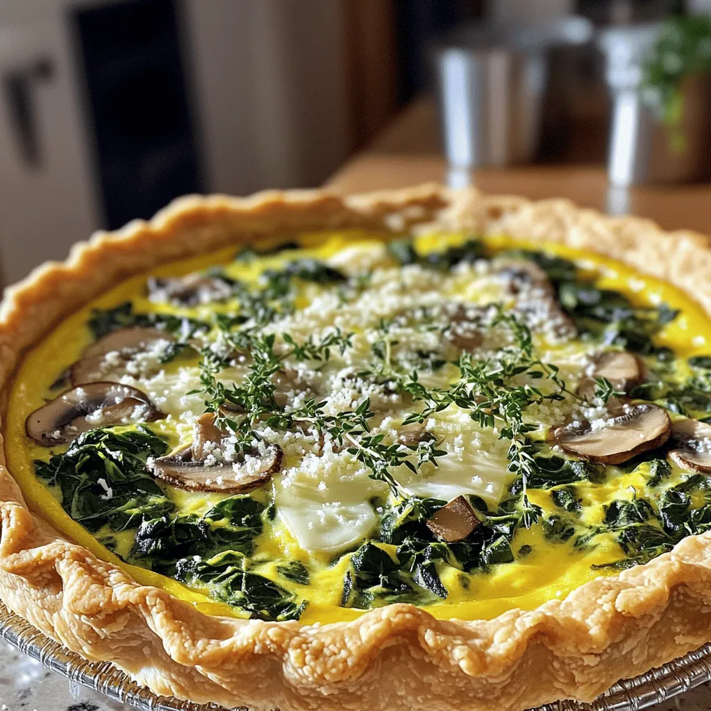 For the cheese, Swiss gives a creamy texture, while parmesan adds a salty bite. Eggs and milk create a rich filling that binds everything together. Onions and garlic add depth to the dish, making it more flavorful. Dried thyme brings a warm aroma that complements the spinach and mushrooms.