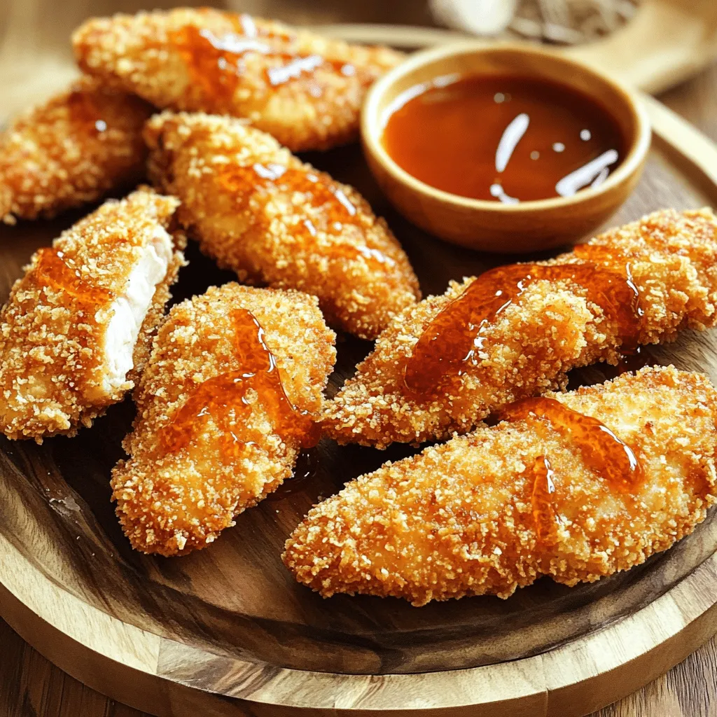 ![- 1 pound chicken tenders - ½ cup all-purpose flour - ½ teaspoon garlic powder - ½ teaspoon paprika - ¼ teaspoon salt - ¼ teaspoon black pepper - ½ cup buttermilk - 1 cup breadcrumbs (panko preferred for extra crunch) - ¼ cup honey - ¼ cup Sriracha sauce - 1 tablespoon soy sauce - 1 tablespoon apple cider vinegar - Oil for frying I love using chicken tenders in this recipe. They cook fast and stay juicy. The marinade brings a great kick. Buttermilk makes the chicken tender and flavorful. Sriracha adds heat, while soy sauce and vinegar add depth. For the coating, I use flour mixed with spices. It gives a nice crunch when fried. Panko breadcrumbs are my go-to for extra crispiness. They make the chicken tenders even more delightful. - Additional spices for extra flavor - Fresh herbs for garnishing You can spice things up using cayenne pepper or chili powder. Fresh herbs like cilantro or green onions make a beautiful garnish. They add color and freshness to the dish. - Deep skillet or frying pan - Cooking thermometer A deep skillet or frying pan helps cook the tenders evenly. I always use a cooking thermometer to check the chicken's internal temperature. You want it to be at least 165°F for safe eating. For the full recipe, check out the [Full Recipe]. To start, mix the marinade. In a medium bowl, combine buttermilk, Sriracha, soy sauce, and apple cider vinegar. This mix gives the chicken a sweet and spicy kick. Add the chicken tenders and coat them well. Cover the bowl and refrigerate for at least 30 minutes. For a deeper flavor, marinate for up to 2 hours. Next, prepare your breading station. In a shallow dish, mix the flour, garlic powder, paprika, salt, and black pepper. This blend adds flavor to the chicken. In another shallow dish, place the breadcrumbs. Panko works best for extra crunch. Once your chicken is marinated, take it out. Let any excess marinade drip off. Dredge each tender first in the flour mix. Then dip it back into the buttermilk. Finally, coat it in breadcrumbs, pressing lightly to help it stick. Now, it’s time to cook! Heat oil in a large skillet over medium-high heat. The oil should be hot but not smoking. Carefully add the coated chicken tenders in batches. Avoid overcrowding the pan. Cook each side for about 3-4 minutes. The tenders should turn golden brown and reach an internal temperature of 165°F. Use a cooking thermometer to check doneness. This ensures your chicken is safe to eat. Once done, remove the chicken from the skillet. Place it on a paper towel-lined plate to drain excess oil. Enjoy your Sriracha honey chicken tenders with the sauce from the Full Recipe! To get crispy chicken tenders, I recommend using panko breadcrumbs. They create a great crunch. You can also mix in some crushed cornflakes for extra texture. To prevent sogginess, let the chicken rest after coating. This helps the breading stick well. Fry the chicken in hot oil, around 350°F. This ensures a nice golden brown crust. To boost flavor, add spices to your marinade. Try adding a pinch of cayenne for a kick. Fresh herbs like cilantro or parsley can also brighten the taste. For the sauce, balance heat by mixing in more honey if it’s too spicy. You can also add a splash of lime juice for a fresh twist. These chicken tenders pair well with many sides. Consider serving them with crispy fries or a fresh salad. You can also make a dipping bar with the Sriracha honey sauce. Try serving it in small bowls for fun. For a twist, drizzle the sauce over rice or use it in tacos. For the complete recipe, check out the Full Recipe. {{image_2}} You can make Sriracha honey chicken tenders healthier by baking instead of frying. Baking cuts down on the oil and fat. To do this, preheat your oven to 400°F (200°C). Place the breaded tenders on a baking sheet lined with parchment paper. Bake for about 15-20 minutes, turning halfway, until golden and cooked through. If you need gluten-free options, use almond flour or coconut flour instead of regular flour. For breadcrumbs, try gluten-free panko or crushed rice cereal. These swaps keep the crunch while catering to dietary needs. You can play with the heat in your chicken tenders. Try using different types of hot sauces, like chipotle or jalapeño sauce, to add unique flavors. Adjust the amount of Sriracha in the marinade for a milder or spicier kick. Start with a tablespoon and add more to taste. You can find your perfect balance of heat this way. Pair your chicken tenders with different sauces for a fun twist. You can try ranch dressing, blue cheese, or a tangy barbecue sauce. For a signature sauce, mix Sriracha with honey and soy sauce. This combo adds depth and flavor. Combine flavors and see what you like best! For the full recipe, check out the details above. After enjoying your Sriracha honey chicken tenders, store any leftovers right away. Place them in an airtight container. This keeps them fresh and tasty. I recommend using glass containers or BPA-free plastic ones. These materials help avoid any off-flavors. Be sure to refrigerate the chicken tenders within two hours after cooking. This prevents bacteria from growing. When you want to enjoy the chicken tenders again, reheating them requires care. The best way to keep them crispy is to use the oven. Preheat your oven to 375°F (190°C). Place the chicken tenders on a baking sheet. Heat them for about 10-15 minutes. Check that they reach an internal temp of 165°F (74°C). You can also use an air fryer for a quick reheat. Set it to 375°F and cook for about 5-7 minutes. If you want to save some chicken tenders for later, freezing is a great option. First, let them cool completely. Then, place them in a single layer on a baking sheet. Freeze them for about one hour. After that, transfer the tenders to a freezer-safe bag. Make sure to remove as much air as possible. To thaw, place them in the fridge overnight. If you're in a hurry, use the microwave. Just remember to reheat them in the oven 