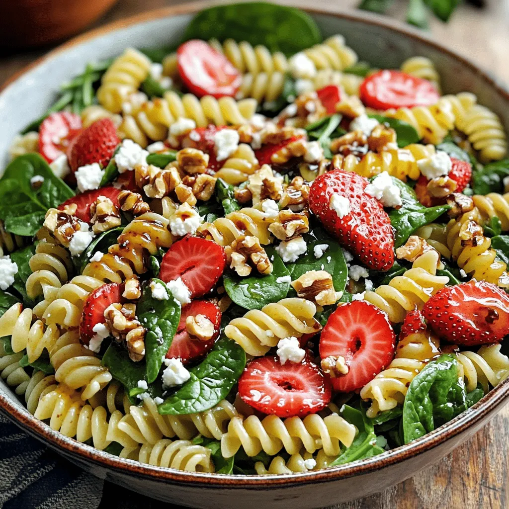 The main ingredients in this dish bring bright flavors and colors. Whole wheat pasta gives a nice bite. Fresh spinach adds a lush green crunch. Strawberries burst with sweetness. Feta cheese gives a tangy kick that balances the salad.