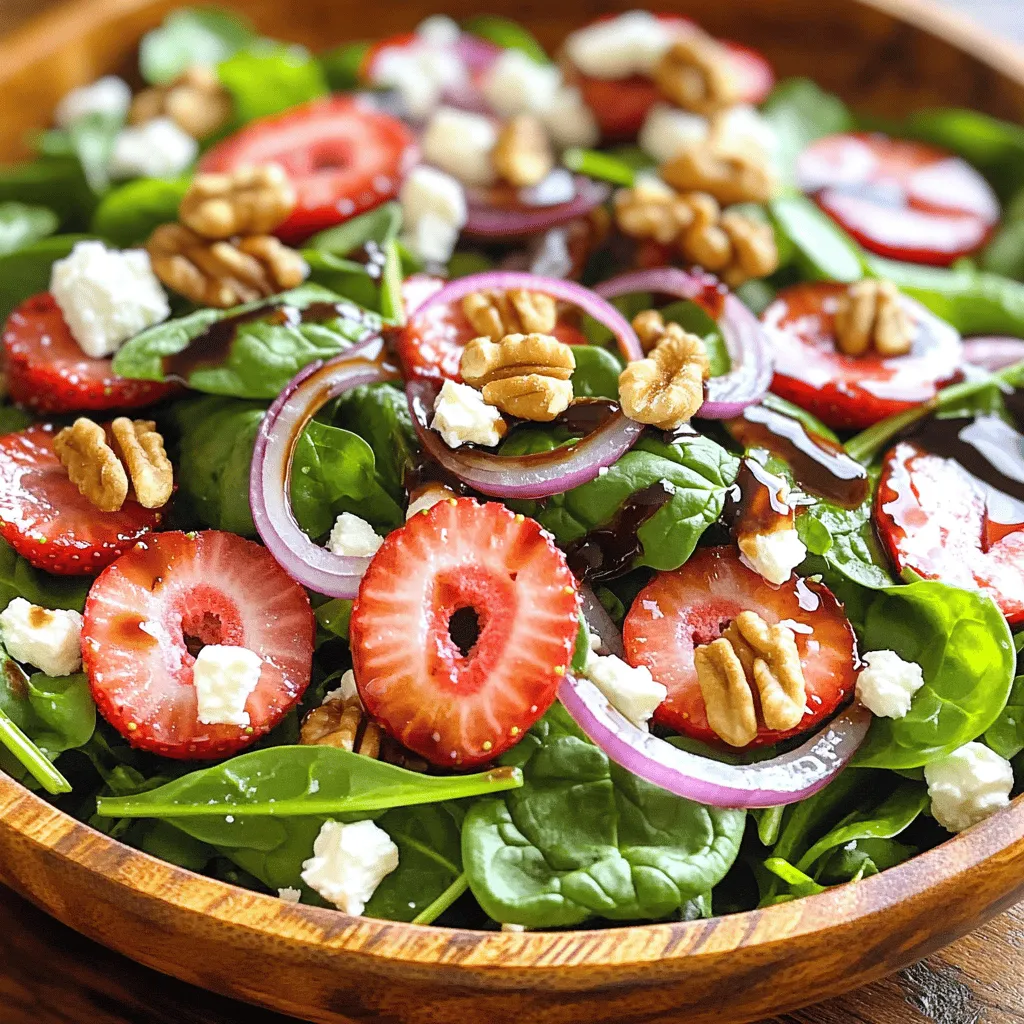 ![To make a delicious Strawberry Spinach Salad, you need fresh items. Here’s what you need: - 6 cups fresh spinach, washed and dried - 1 cup strawberries, hulled and sliced - ½ cup walnuts, toasted - ¼ cup feta cheese, crumbled - 1 small red onion, thinly sliced These fresh ingredients give the salad great color and taste. The spinach adds a nice crunch. Strawberries bring a sweet touch, while walnuts add a nutty flavor. Feta cheese gives a creamy bite, and red onion adds a sharp taste. Now, let's look at pantry items you need for the dressing: - ¼ cup balsamic vinegar - 2 tablespoons honey - 3 tablespoons olive oil - Salt and pepper to taste These pantry items help create a dressing that’s both sweet and tangy. Balsamic vinegar adds depth, and honey balances the acidity. Olive oil gives the dressing a smooth texture. Salt and pepper bring out all the flavors. This recipe serves four people. Each serving has a good mix of nutrients. Spinach is packed with vitamins and minerals. Strawberries are rich in antioxidants. Walnuts provide healthy fats. Feta cheese adds protein. This salad is not just tasty; it’s also healthy. It’s perfect for a light lunch or dinner side. You can check the [Full Recipe] for more details on preparation and serving tips. Enjoy! To make Strawberry Spinach Salad, start with fresh ingredients. You need 6 cups of spinach, 1 cup of strawberries, ½ cup of walnuts, and ¼ cup of feta cheese. Also, gather 1 small red onion, ¼ cup of balsamic vinegar, 2 tablespoons of honey, and 3 tablespoons of olive oil. Wash and dry the spinach well. Hull and slice the strawberries thinly. Toast the walnuts in a pan for extra flavor. Thinly slice the red onion for a crisp bite. In a large mixing bowl, combine the spinach, strawberries, walnuts, feta cheese, and red onion. Gently mix them together. Use your hands or a large spoon for this. Make sure everything is evenly distributed. The colors will be bright and inviting. This step is important because it helps blend the flavors. In a small bowl, whisk together the balsamic vinegar, honey, and olive oil. Mix until the dressing is well-blended and a bit thick. Drizzle this dressing over the salad ingredients. Gently toss everything to coat well. Add salt and pepper to taste. Allow the salad to sit for a few minutes. This lets the flavors mix together nicely. Serve it fresh for the best taste. You can find the Full Recipe for more details. When picking strawberries, look for bright red color. The best berries feel firm and plump. Avoid ones with soft spots or dark patches. The green leaves should be fresh and green, not wilted. If you can, smell them. Good strawberries have a sweet aroma. Local farmers' markets often have the freshest options. Always wash strawberries right before you plan to use them. If you have leftover salad, store it in an airtight container. Keep the dressing separate to prevent sogginess. The salad stays fresh for about one day in the fridge. Before eating, check for any wilted greens or soggy fruit. If it looks good, toss in some fresh spinach or new strawberries to brighten it up. To boost the flavor, add nuts or seeds for crunch. Try using sunflower seeds or slivered almonds for a twist. Fresh herbs like basil or mint can add a unique touch. To make it sweeter, drizzle more honey or add sliced apples. Experiment with different cheeses too, like goat cheese or blue cheese. Each change can create a new taste adventure. For more details, check out the Full Recipe. {{image_2}} Want to make your salad heartier? Add protein! Grilled chicken adds great flavor. Shrimp also works well and cooks quickly. For a vegetarian option, try chickpeas or black beans. Each adds a nice texture and boost of protein. You can also use tofu for a vegan twist. The dressing can change the whole vibe of your salad. Balsamic vinegar is classic, but you can try honey mustard. A creamy ranch dressing pairs nicely with strawberries too. If you want something light, use lemon juice and olive oil. Each dressing brings its own taste to the mix. Don’t limit yourself to strawberries! In summer, use peaches or nectarines. Apples or pears work well in fall. In winter, try pomegranate seeds for a pop of color. Each season offers unique fruits to explore. Swap fruits to keep the salad fresh and exciting. For the full recipe, check out the details above. To keep your salad fresh, store each ingredient separately. Place spinach in a dry bag. Keep strawberries in a container with air holes. This prevents them from getting mushy. Walnuts should stay in a cool, dark place. Use an airtight container for feta cheese. Make sure to keep it chilled. Once mixed, the salad tastes best right away. However, it can last in the fridge for 1 to 2 days. The spinach may wilt after that time. If you mixed it with the dressing, it might not last as long. The salad may lose its crunch after a day. Always check for freshness before eating. Freezing this salad is not a good idea. Fresh spinach and strawberries do not freeze well. They lose their texture and flavor when thawed. If you want to save some ingredients, freeze the walnuts. They will stay fresh for a few months. For the best taste, use fresh ingredients from the Full Recipe. Yes, you can prepare parts of the salad ahead of time. Wash and dry the spinach early. Slice the strawberries and store them in the fridge. Keep them separate from the dressing. Mixing it all together right before serving keeps it fresh. This way, the spinach stays crisp, and the strawberries remain juicy. This salad pairs well with many side dishes. Grilled chicken adds protein and flavor. You can also serve it with garlic bread for a nice touch. Rice or quinoa can add heartiness to your meal. For a lighter option, serve it with a bowl of soup. To make this salad vegan, skip the feta cheese. You can use vegan cheese or just leave it out. Replace honey with maple syrup for a sweet touch. This way, you keep the taste great while ma