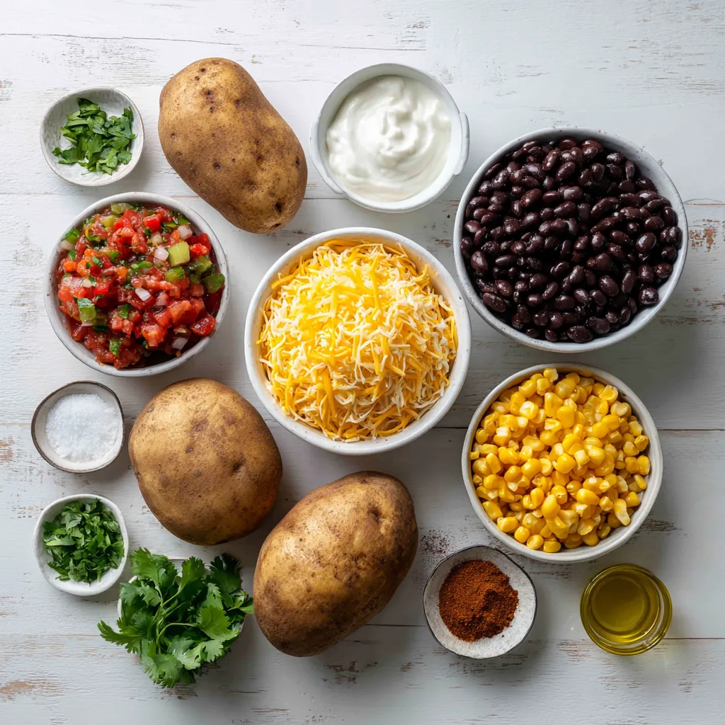 - While the potatoes are baking, prepare the stuffing mixture. In a large bowl, combine the black beans, corn, pico de gallo, shredded cheddar cheese, cumin, chili powder, and a pinch of salt and pepper. Mix well until all ingredients are incorporated.