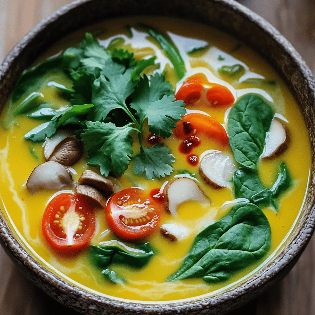 Coconut milk is the base of this soup. It gives a rich and creamy texture. Vegetable broth adds depth and flavor. Lemongrass provides a bright, citrusy note. Kaffir lime leaves lend a fragrant aroma.
