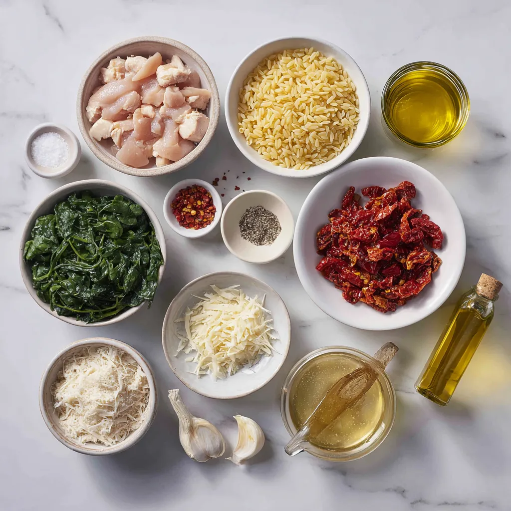 - In a large mixing bowl, combine the cooked chicken, orzo pasta, chicken broth, drained diced tomatoes, chopped spinach, and sundried tomatoes. Mix until well combined.