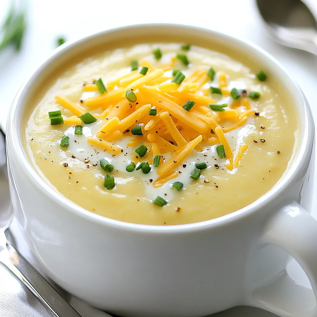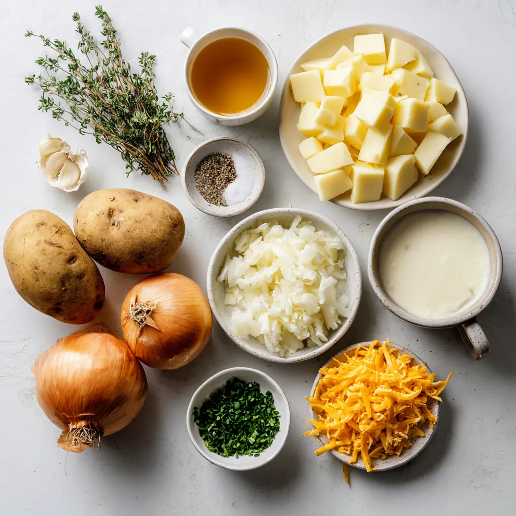 When you choose potatoes, go for russets. They are starchy and creamy. You need four large ones. For the onion, use a medium-sized one, finely chopped. Garlic adds flavor; two cloves will do. For broth, four cups of vegetable broth give a rich base. Heavy cream adds that creamy texture, so one cup is perfect. Butter adds flavor; two tablespoons will help sauté the onions. Thyme brings a nice aroma; one teaspoon is enough. Salt and pepper should be adjusted to your taste. Lastly, for that cheesy goodness, one cup of shredded sharp cheddar is key, topped with a quarter cup of fresh chives for garnish.