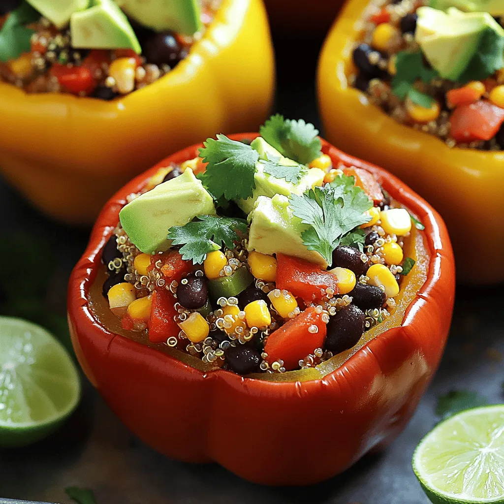 Stuffed bell peppers are easy and fun to make. You start with fresh ingredients like bell peppers, quinoa, and black beans. Then, you mix those with tomatoes and spices. After baking them, you can top with cilantro or avocado. This dish is not only tasty but also healthy.