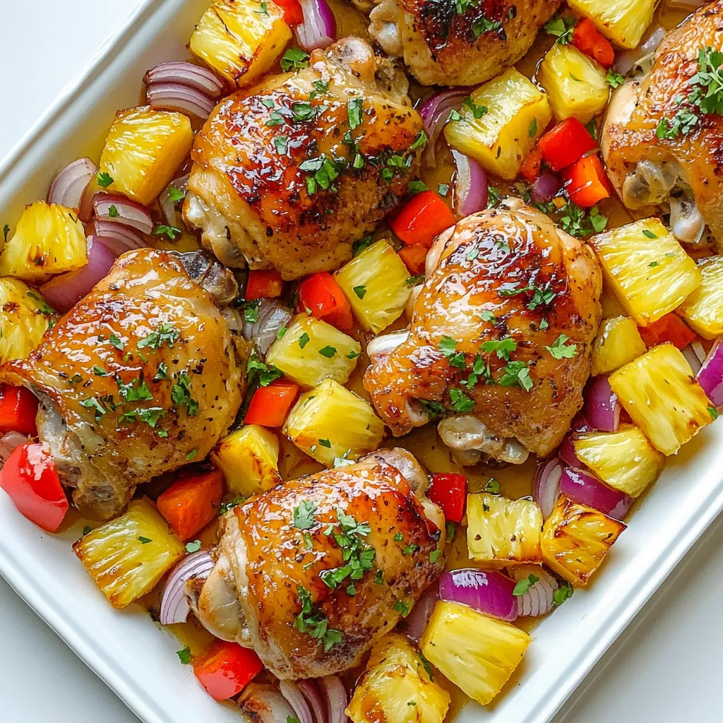 - Place the marinated chicken thighs on top of the vegetables and pineapple. Drizzle any remaining marinade over the chicken and veggies.