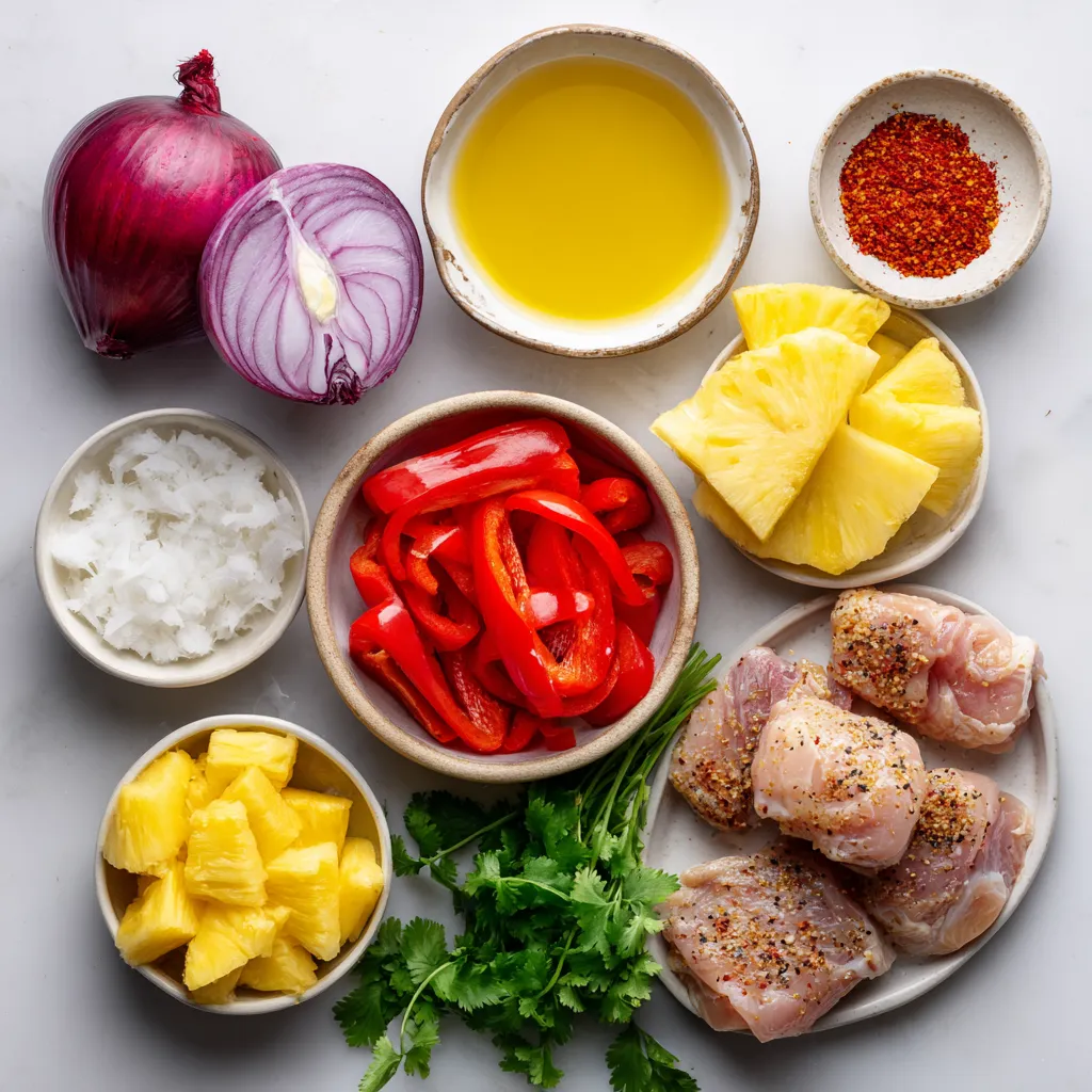 These ingredients create a colorful and tasty dish. The chicken thighs give a rich flavor. The bell peppers add crunch. Pineapple brings a sweet twist. Together, they create a perfect balance. The coconut aminos add depth without soy. Garlic and ginger elevate the taste. Turmeric gives a warm color and health benefits. Red pepper flakes can spice it up if you like heat. Fresh cilantro brightens the dish, making it visually appealing. Each bite will take you to the islands. Enjoy gathering these ingredients for your meal!